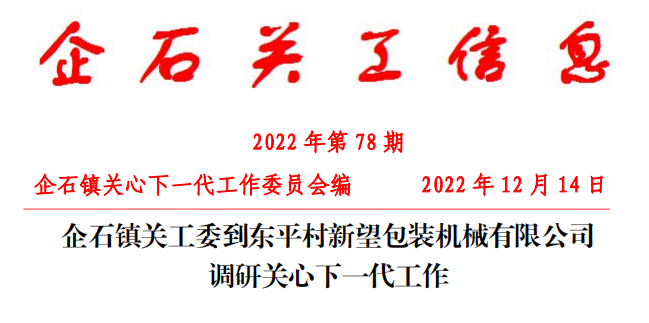 12 月 14 日上午,企石鎮(zhèn)關(guān)工委到東平村新望包裝機(jī)械有限公司調(diào)研關(guān)心下一代工作。企石鎮(zhèn)關(guān)工委主任楊煥柱,關(guān)工委副主任黃林燦、劉毅然,東平村關(guān)工委主任李堯木,公司董事長羅永輝等參加了調(diào)研活動。